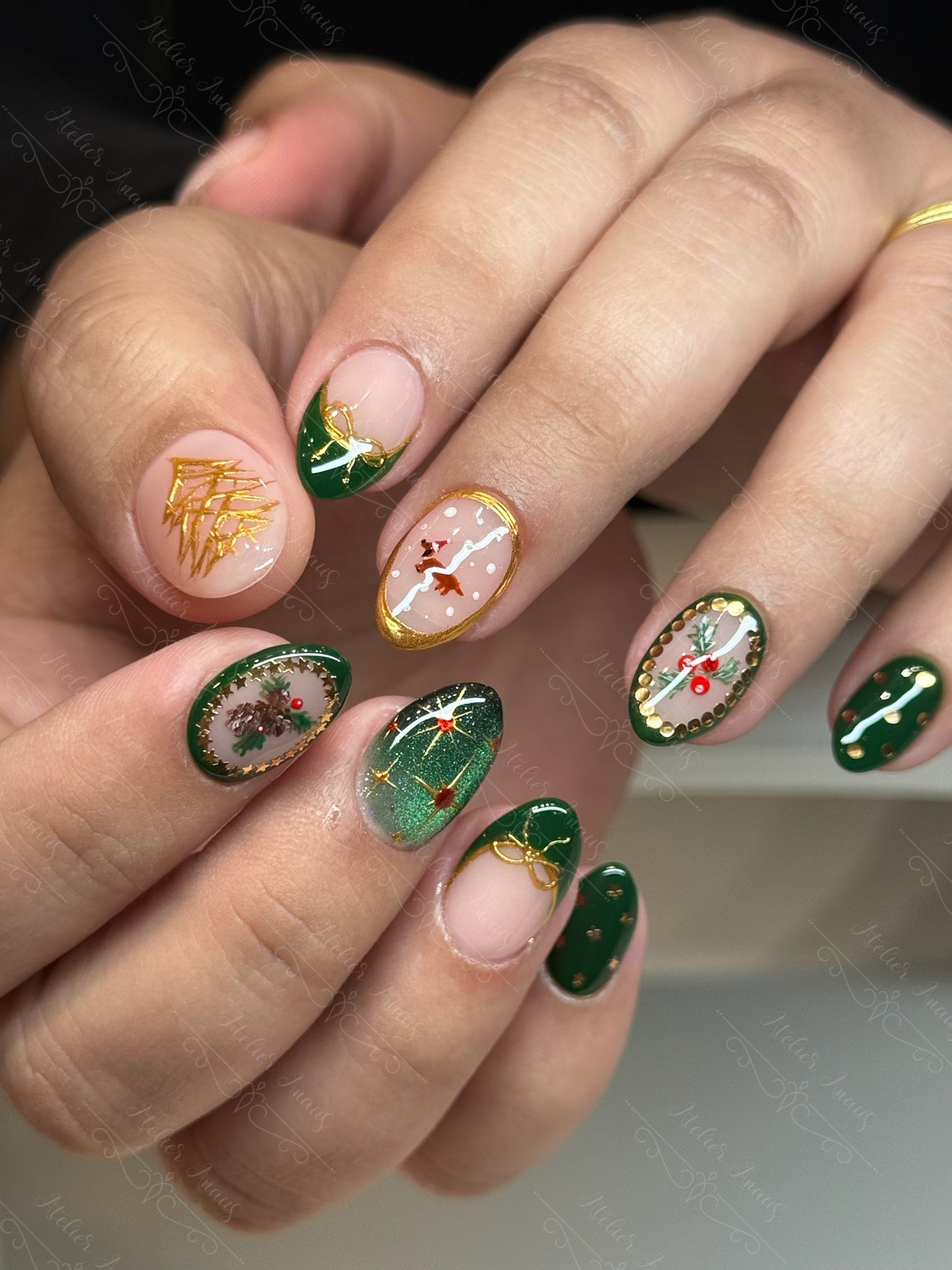 featuring green and gold French nail art with gold bows and holly tree leaves