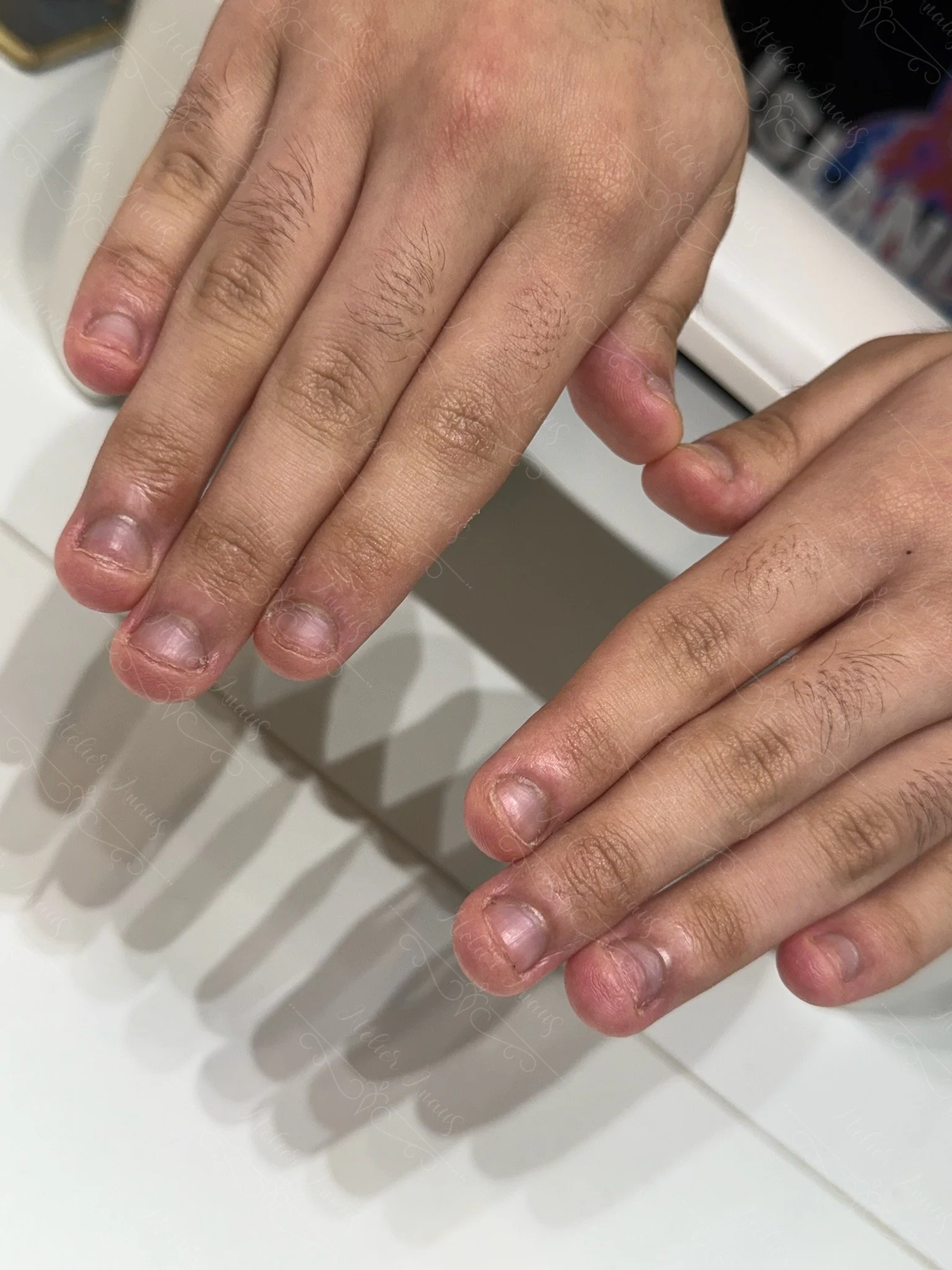 For the first appointment, we treated the hangnails, gently filed the nail tips — since their nails were already short, we did not trim — cleaned the nail walls, and reshaped the eponychium.